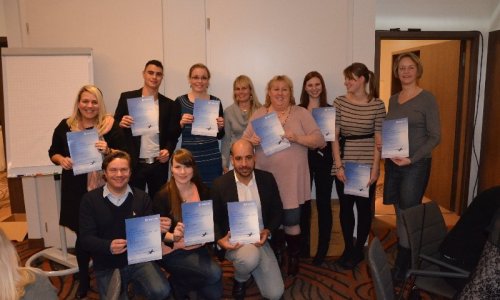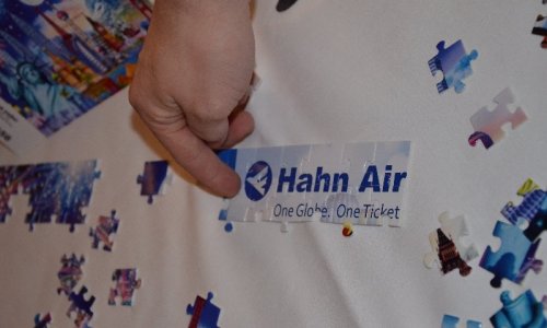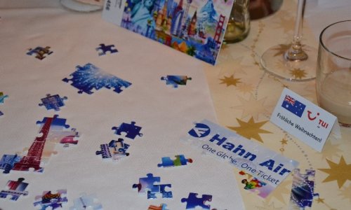 Gerhard Pilop from Hahn Air handed over 10 voucher for the Christmas Party of TUI 4U. To receive one of those voucher they had to do a Hahn Air puzzle.