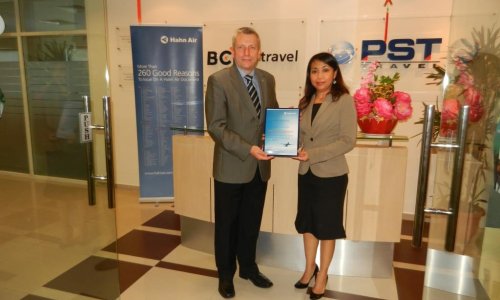 Ralf Masermann from Hahn Air had the chance to meet Ms. Arshad from PST Travel in Kuala Lumpur, Malaysia to hand over the price of 300 Euro credit for their HR UATP e-payment account which the agency won for registering as 3001st HR Ticketing Center on our website.