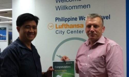 Ralf Masermann from Hahn Air was happy to hand over the prize and the certificate to Phillippine World Travel, the matchday 10 winner of our World Cup betting game "Score to Win".