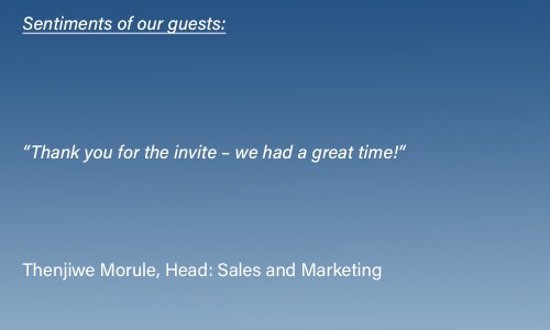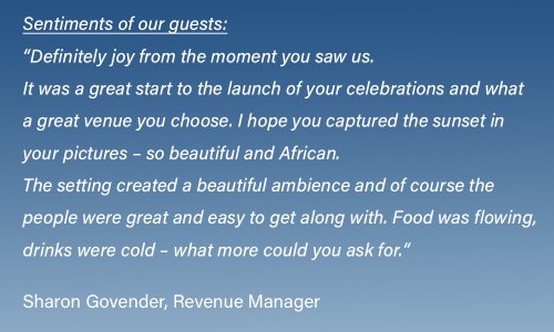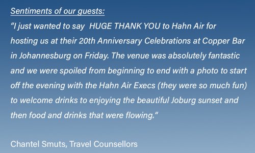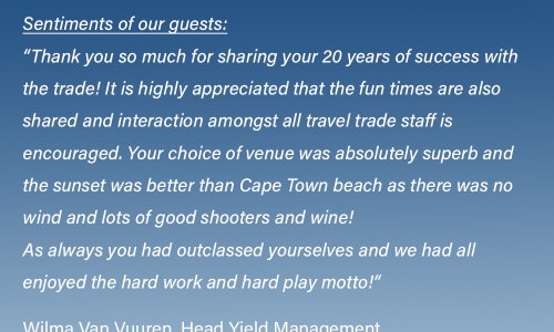 It was a fantastic evening at the rooftop Copper Bar in Bryanston, Johannesburg, the first of seven events to celebrate our 20th anniversary. A huge thank you to the 100 travel consultants who made this an evening to remember!