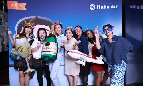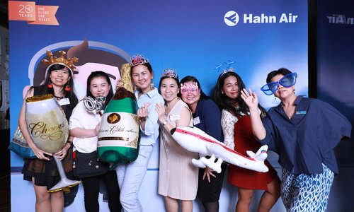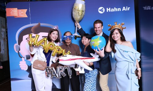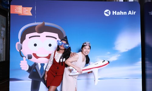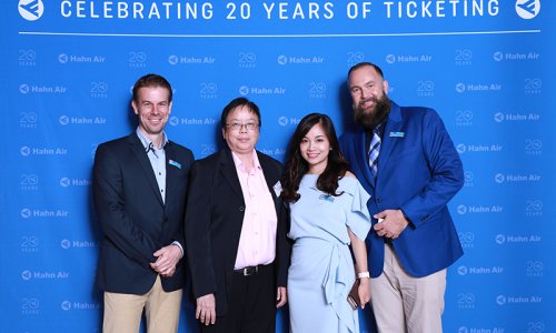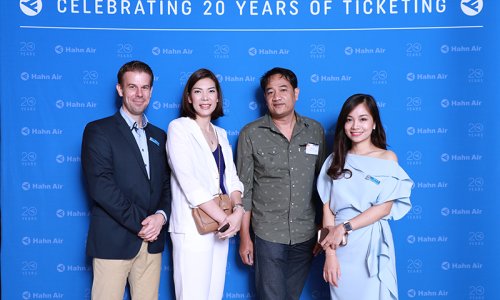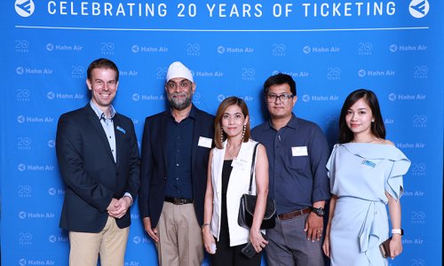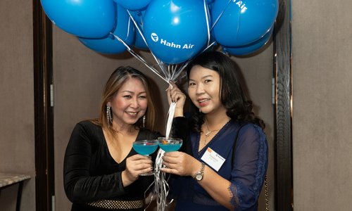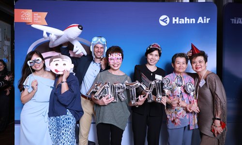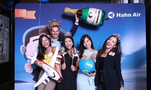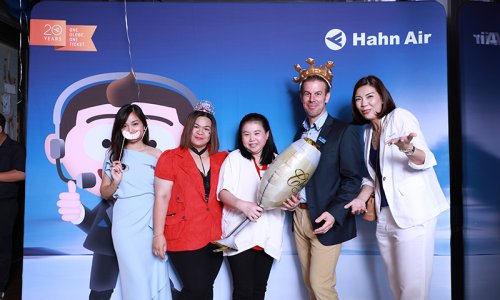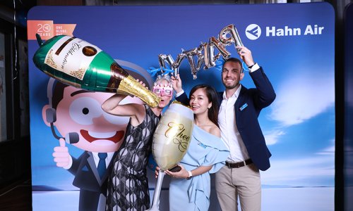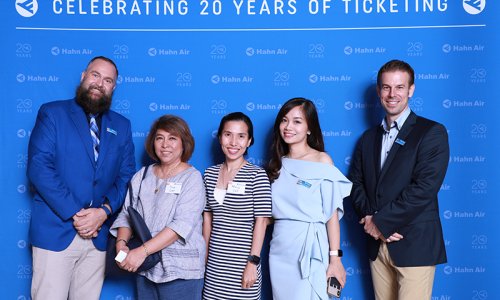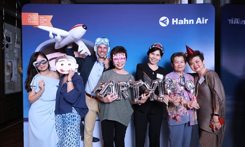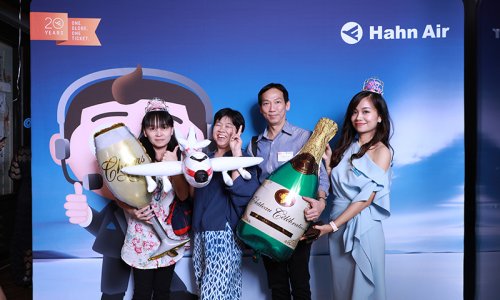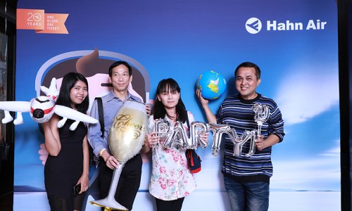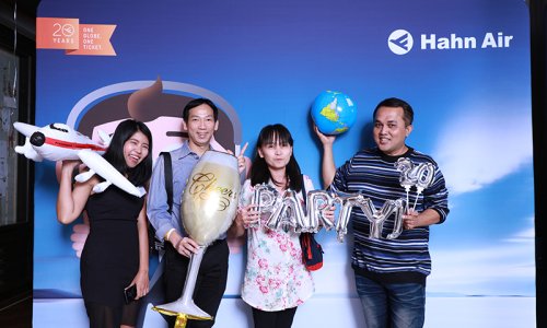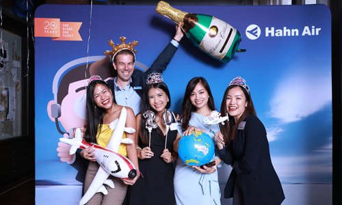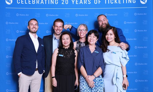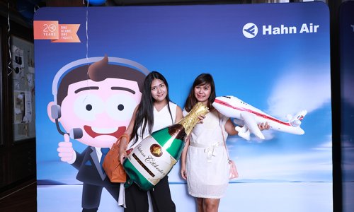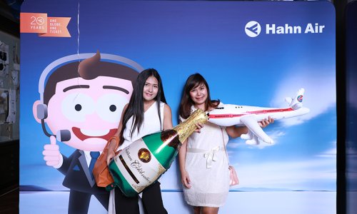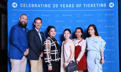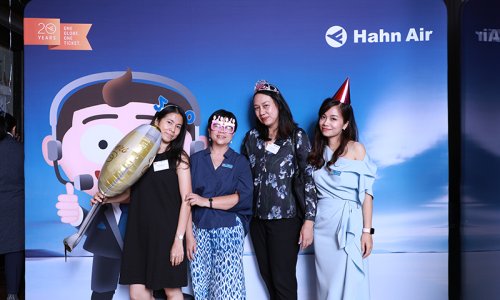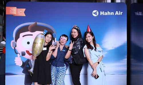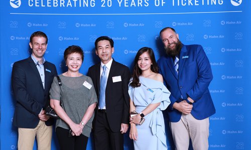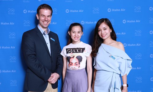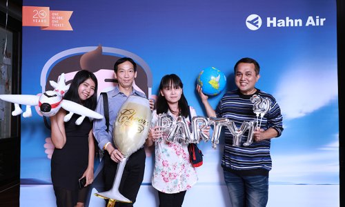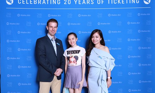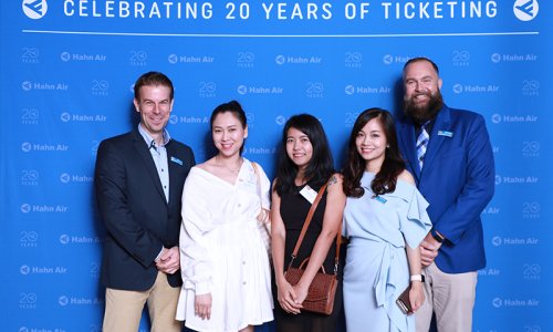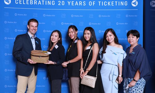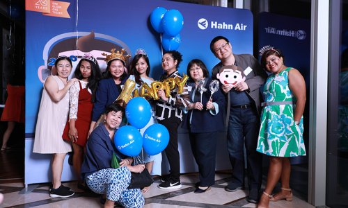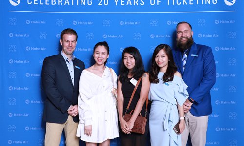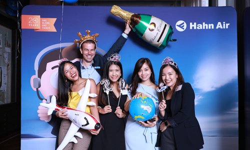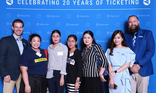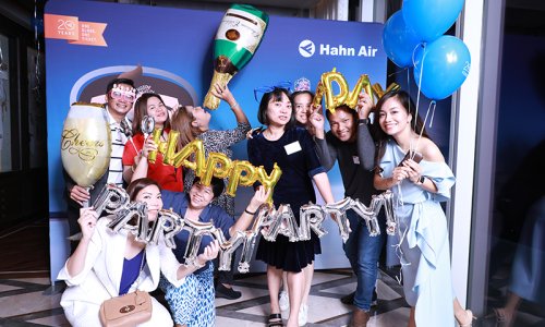 Hahn Air welcomed 100 travel agents, distribution partners and friends to a glamourous evening event in Bangkok. The stylish loft of the 5-star Waldorf Astoria Bangkok invited the guests to enjoy the impressive view on the Magnolias Ratchadamri Boulevard and the skyline of the Central Business District. “Thailand has always been an important market for us. It is no coincidence that we celebrate our fifth birthday parties here, in Bangkok”, said Jörg Troester, Head of Corporate Strategy, Industry and Government Affairs, in his opening speech. “We’d like to thank all partners for trusting in our solutions and for inspiring us to continually advance our services. It is our declared goal to always exceed your expectations and we are looking forward to the next 20 years of amiable cooperation.” Highlights of the evening: A Facebook competition with the Hashtag #LoveHahnAir, a fun photo booth, hundreds of blue balloons and an amazing birthday cake.