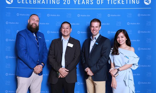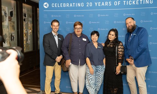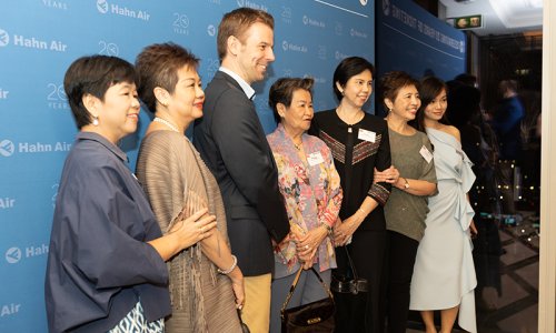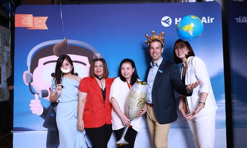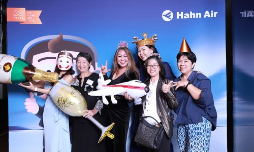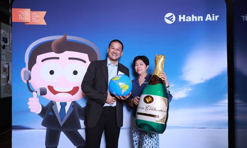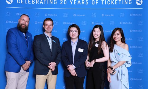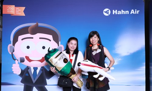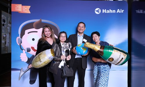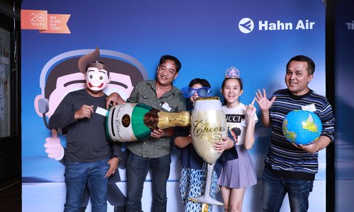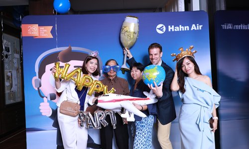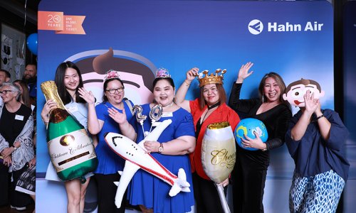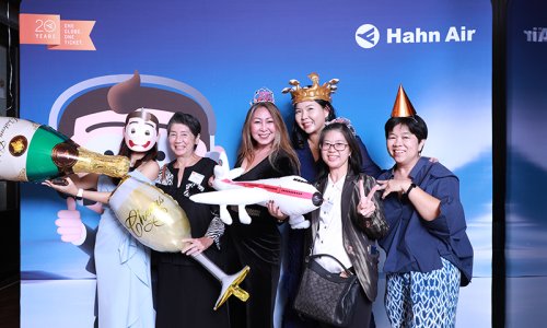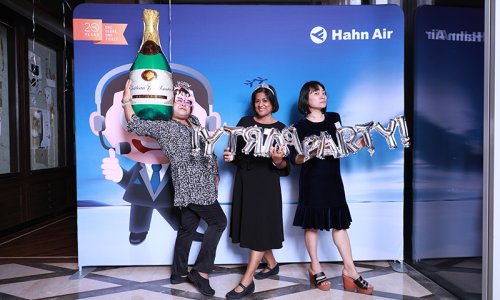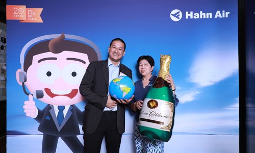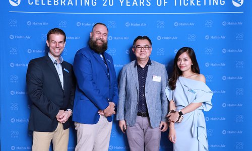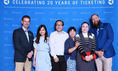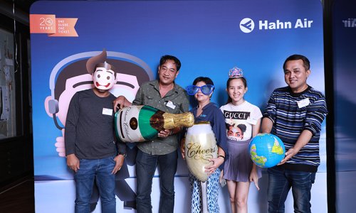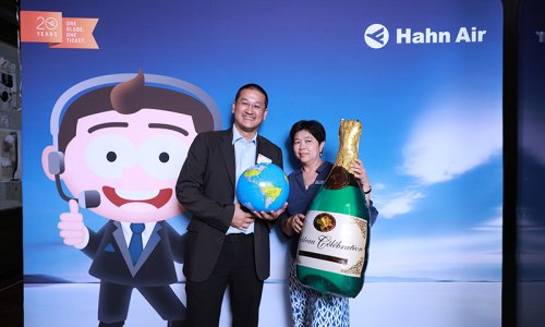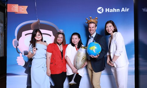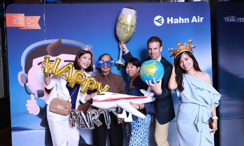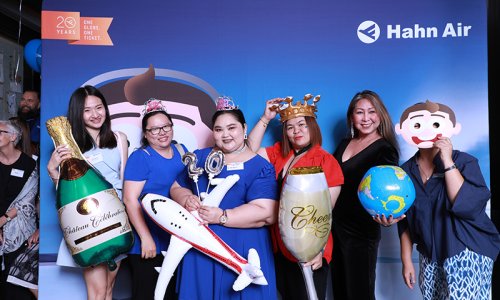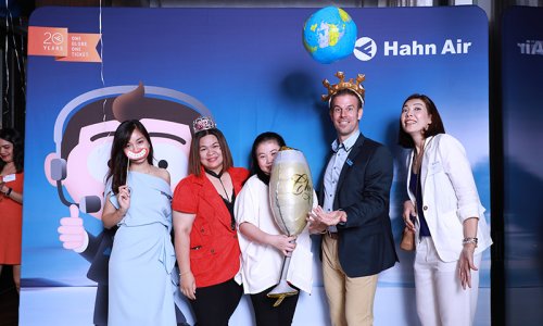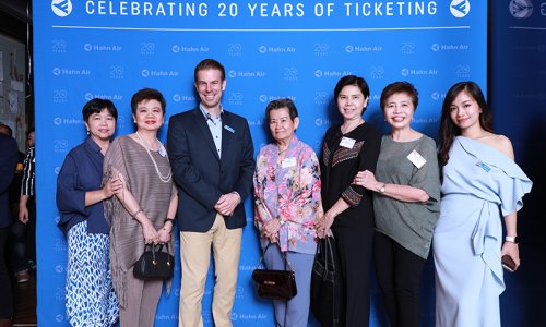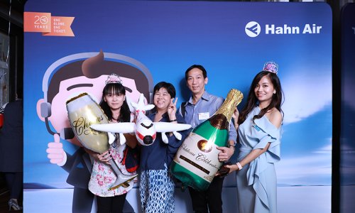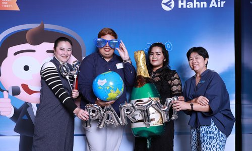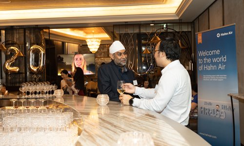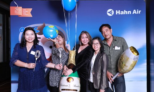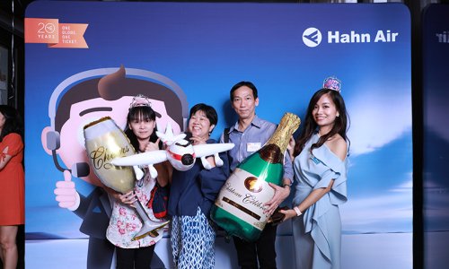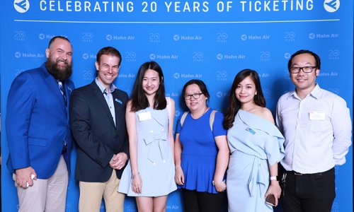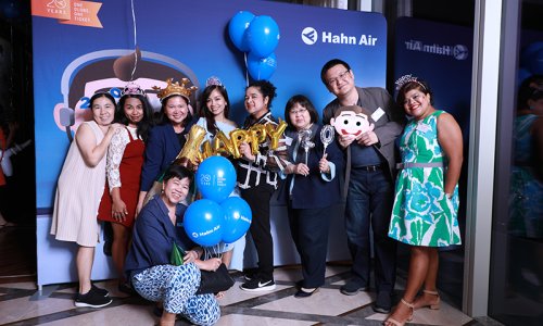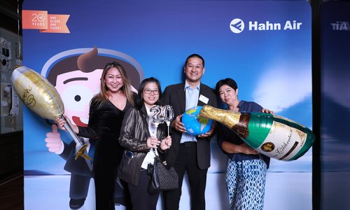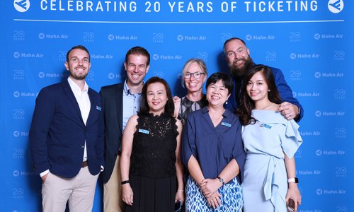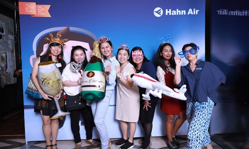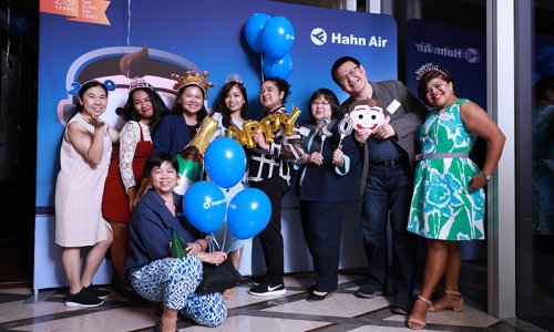 Hahn Air welcomed 100 travel agents, distribution partners and friends to a glamourous evening event in Bangkok. The stylish loft of the 5-star Waldorf Astoria Bangkok invited the guests to enjoy the impressive view on the Magnolias Ratchadamri Boulevard and the skyline of the Central Business District. “Thailand has always been an important market for us. It is no coincidence that we celebrate our fifth birthday parties here, in Bangkok”, said Jörg Troester, Head of Corporate Strategy, Industry and Government Affairs, in his opening speech. “We’d like to thank all partners for trusting in our solutions and for inspiring us to continually advance our services. It is our declared goal to always exceed your expectations and we are looking forward to the next 20 years of amiable cooperation.” Highlights of the evening: A Facebook competition with the Hashtag #LoveHahnAir, a fun photo booth, hundreds of blue balloons and an amazing birthday cake.