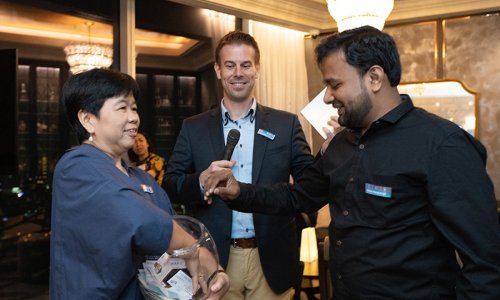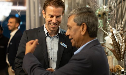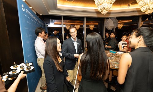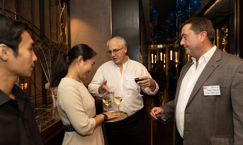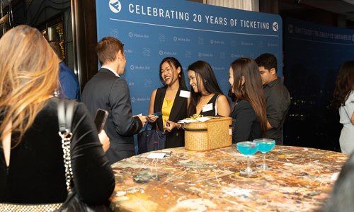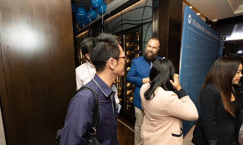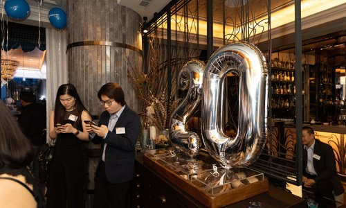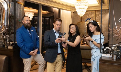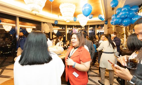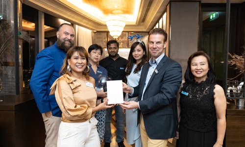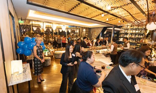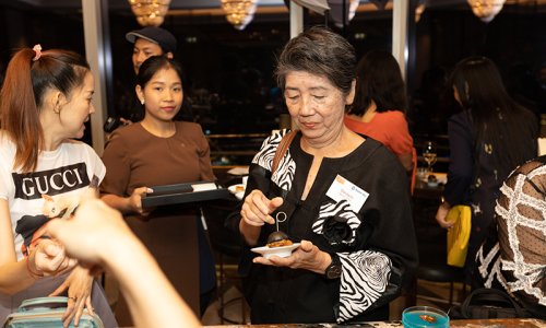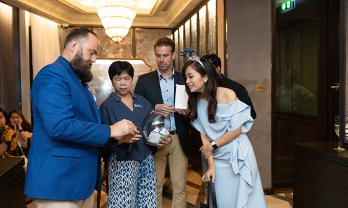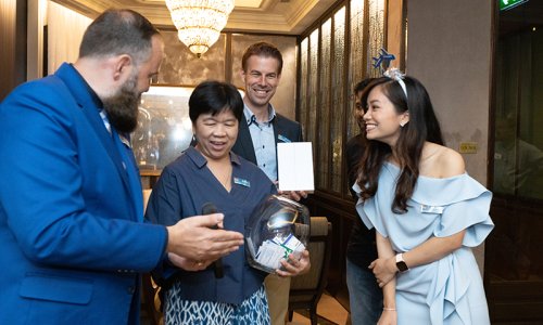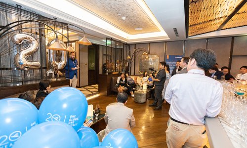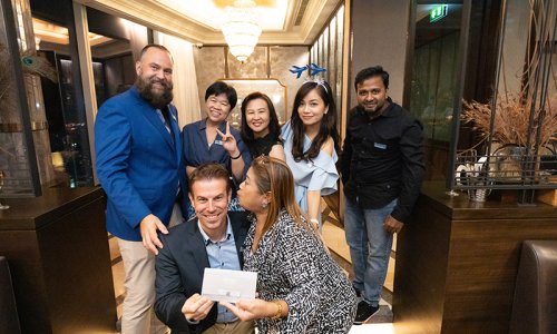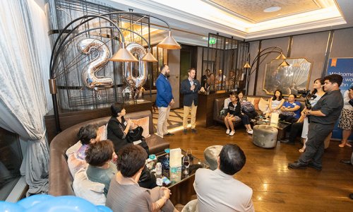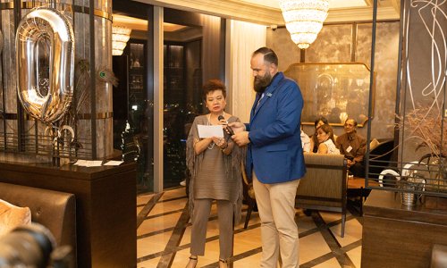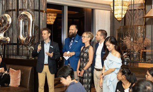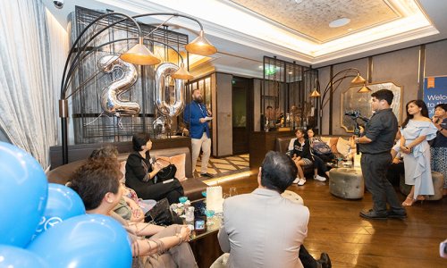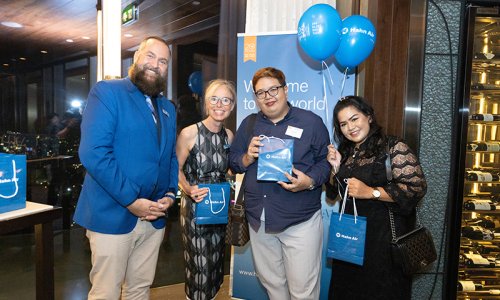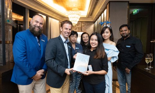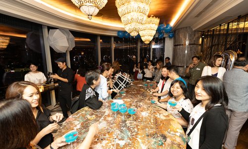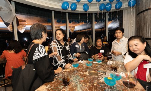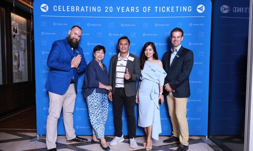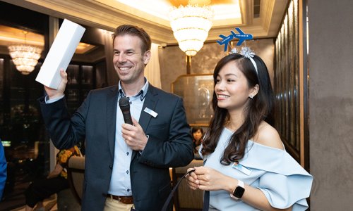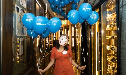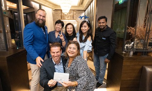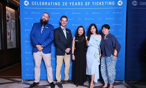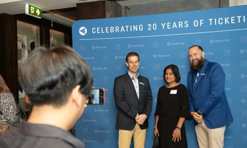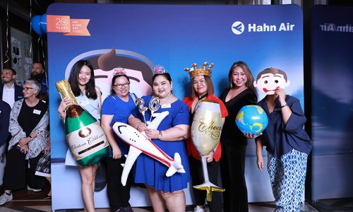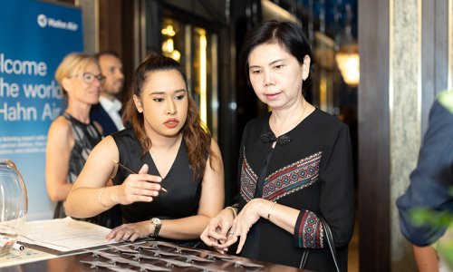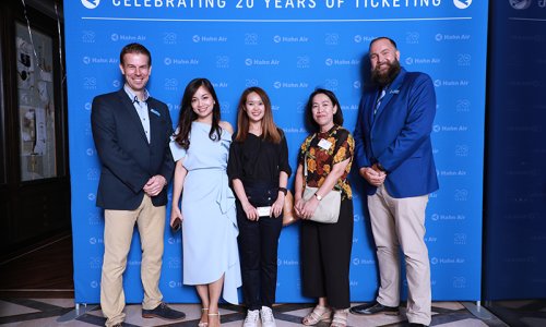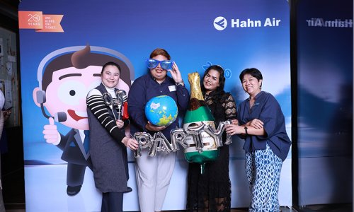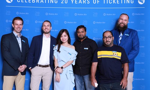 Hahn Air welcomed 100 travel agents, distribution partners and friends to a glamourous evening event in Bangkok. The stylish loft of the 5-star Waldorf Astoria Bangkok invited the guests to enjoy the impressive view on the Magnolias Ratchadamri Boulevard and the skyline of the Central Business District. “Thailand has always been an important market for us. It is no coincidence that we celebrate our fifth birthday parties here, in Bangkok”, said Jörg Troester, Head of Corporate Strategy, Industry and Government Affairs, in his opening speech. “We’d like to thank all partners for trusting in our solutions and for inspiring us to continually advance our services. It is our declared goal to always exceed your expectations and we are looking forward to the next 20 years of amiable cooperation.” Highlights of the evening: A Facebook competition with the Hashtag #LoveHahnAir, a fun photo booth, hundreds of blue balloons and an amazing birthday cake.