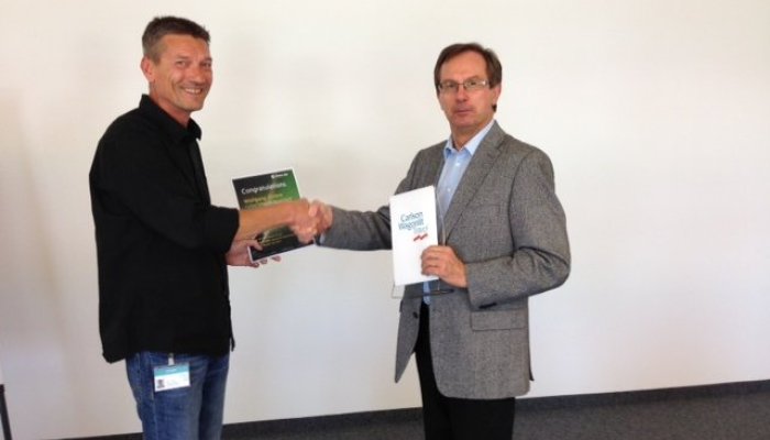 Mr. Grimm from Carlson Wagonlit Travel in Stuttgart receives his certificates for winning Matchday 8 and finishing up in 3rd place in the overall ranking of Score to Win.