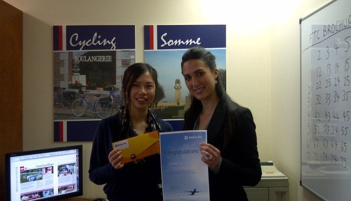 Nathalie Weber, Service Partner of Hahn Air in Australia, hands over the prize of the Travel Today WINter Competition to the lucky winner, Shi Wah Tse from French Travel Connection, and Brett Lemish from Scenic Tours. Our congratulations!