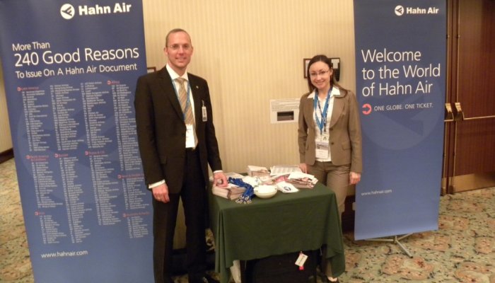 Andreas Ochse, VP and Head of Global Account Management and Maryna Ibragimova, Manager Airline Business Group, participated at the "Transport Services" Conference on 6 - 7 July in Moscow. They enjoyed presenting Hahn Air in English and Russian to the travel agents who visited the conference.