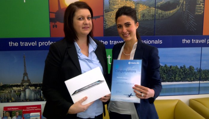 Nathalie Weber, Service Partner of Hahn Air in Australia, hands over the prize of the Travel Daily-Competition to the happy winner, Michelle Pearson. Hahn Air sponsored a new ipad2 as winning item.