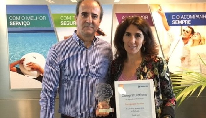 José from Hahn Air's Global Account Management Team handing over our Martin trophy to the Top Performing Agencies in Portugal in 2018.